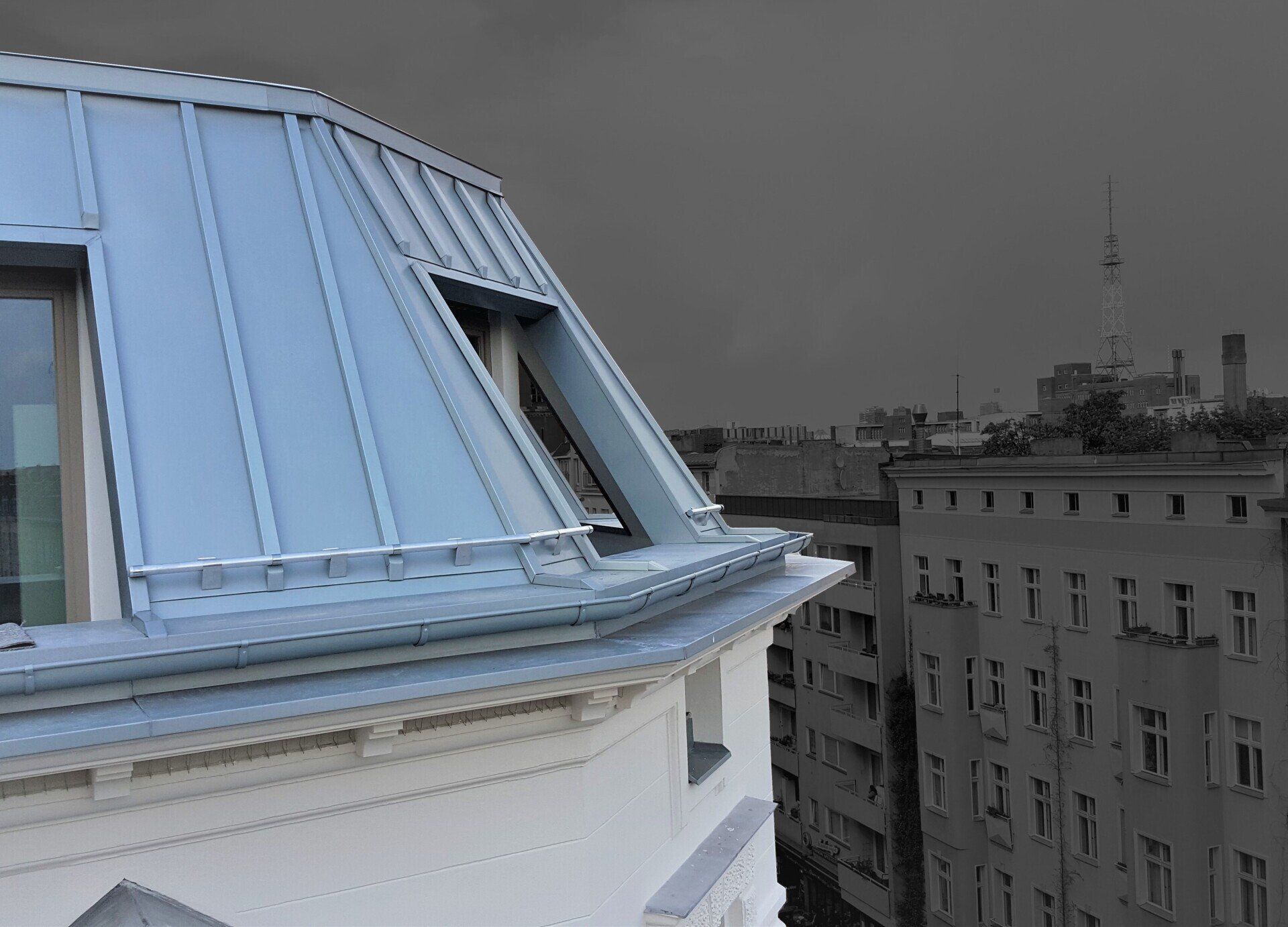 - Mansarddach mit moderner Rheinzink-Leisten-Dacheindeckung im Steildach